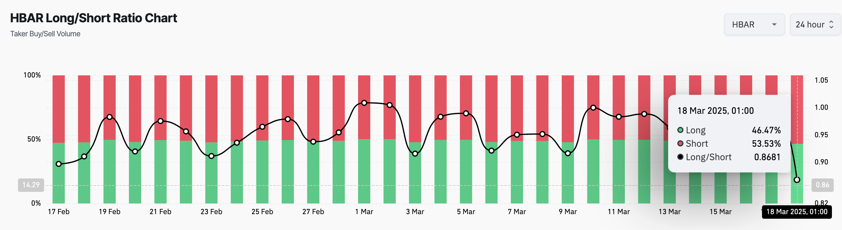 Long/short-suhde mittaa pitkien positioiden (vedot hinnan noususta) ja lyhyiden positioiden (vedot hinnan laskusta) suhdetta markkinoilla. Suhde alle yhden tarkoittaa, että lyhyitä positioita on enemmän kuin pitkiä. Tämä viittaa siihen, että kauppiaat ovat pääasiassa karhumaisia HBAR:n suhteen ja vihjaa suurempaan todennäköisyyteen jatkaa laskua.