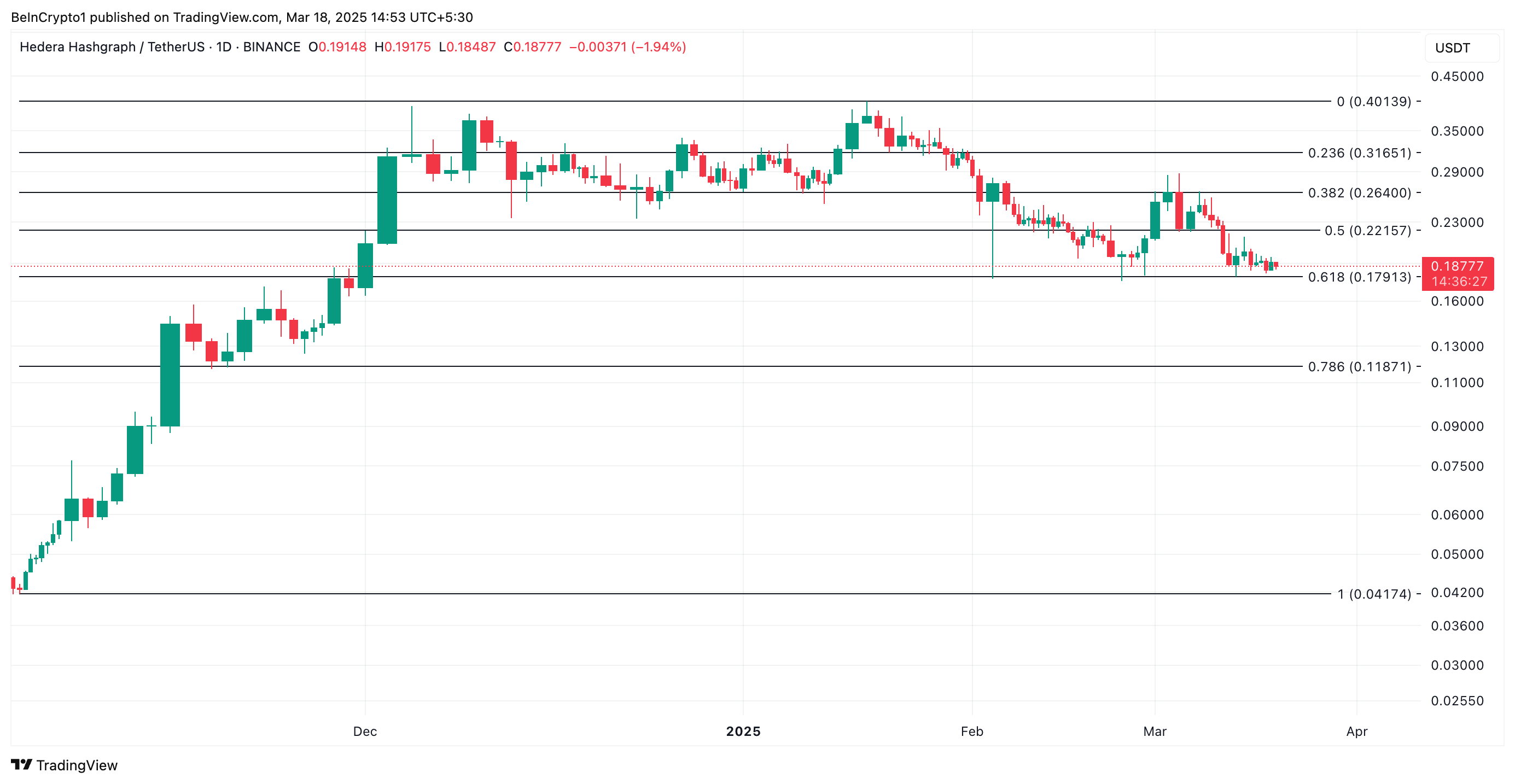 Hedera on edelleen kovassa paineessa, ja se merkitsee jälleen yhtä laskupäivää, kun kauppiaat jatkavat altcoinin vastaisia vetoja. Se käy kauppaa 0,18 dollarilla kirjoitushetkellä, mikä merkitsee 2 % hinnanlaskua viimeisen 24 tunnin aikana.