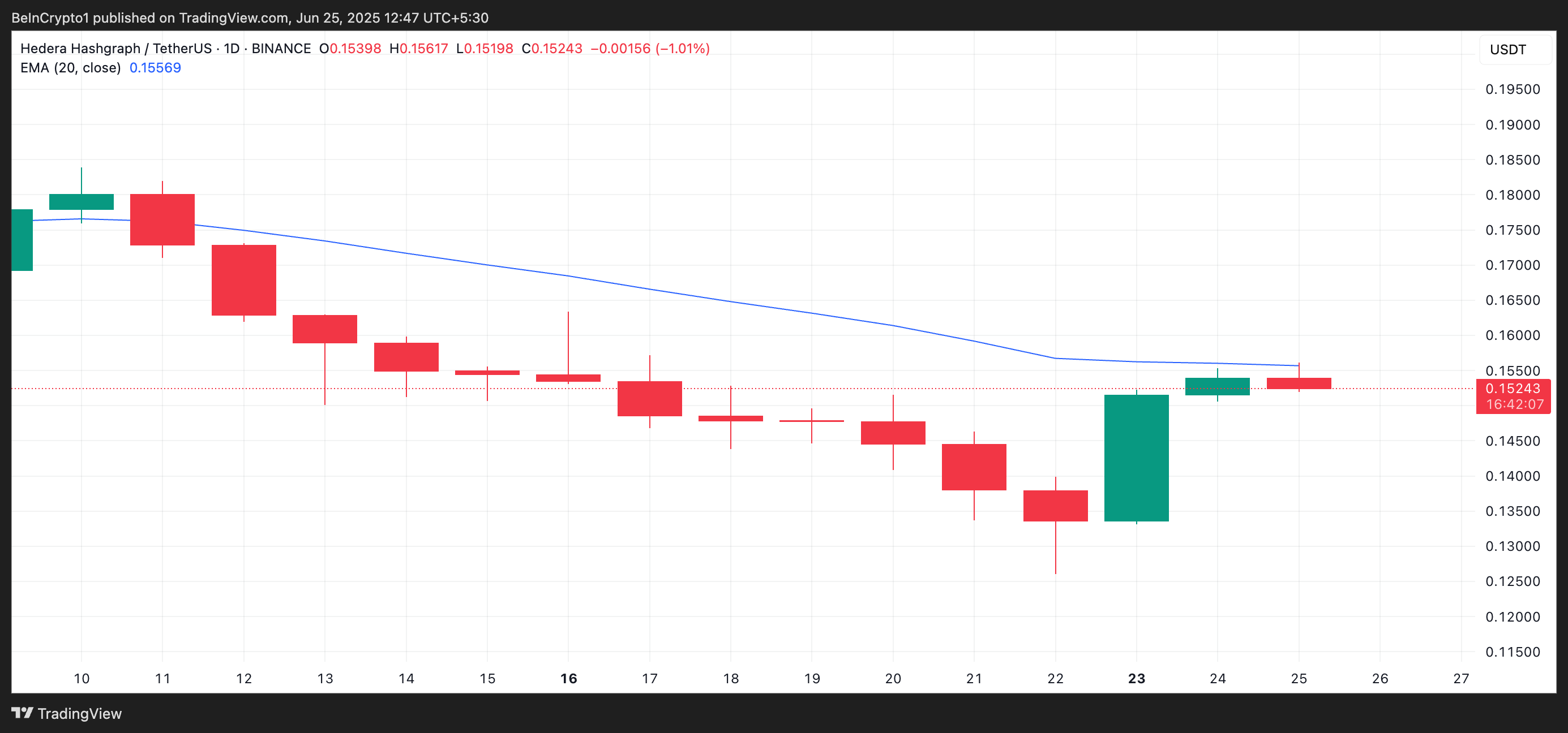 HBAR käy tällä hetkellä kauppaa noin 20 päivän eksponentiaalisen liukuvan keskiarvon (EMA) tasolla päivittäisessä kaaviossa. Tämä keskeinen liukuva keskiarvo mittaa omaisuusvaran keskimääräistä hintaa viimeisten 20 kaupankäyntipäivän aikana, painottaen enemmän viimeaikaisia hintoja.