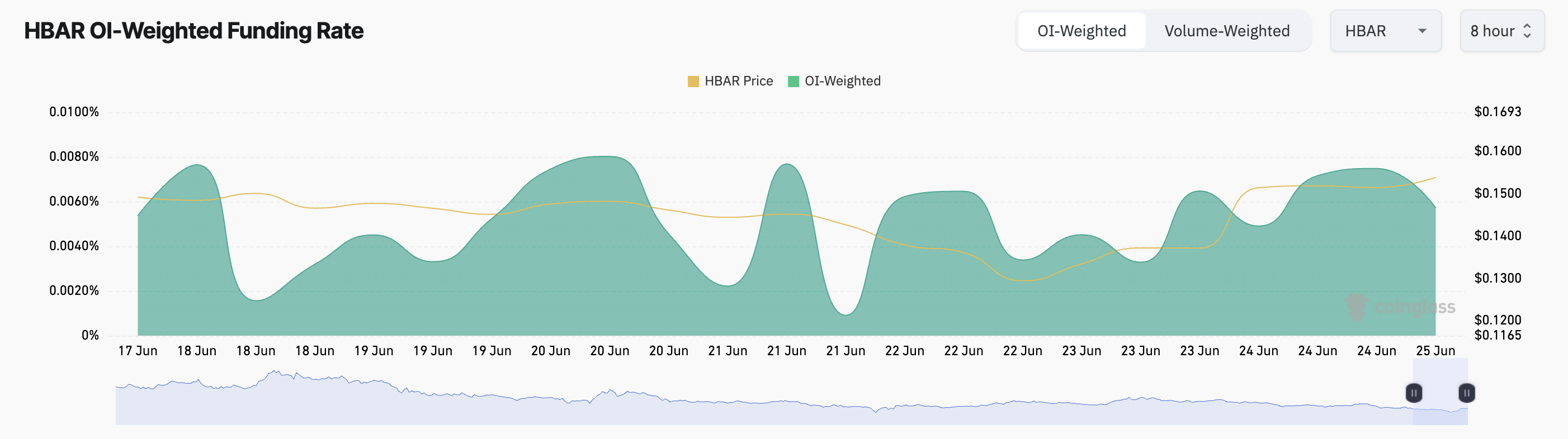 Lisäksi HBAR:n rahoitusaste on pysynyt positiivisena, vaikka sen hinta on viime aikoina laskenut. Se on 0,0057 % kirjoitushetkellä, mikä viittaa siihen, että futuurikauppiaat odottavat edelleen mahdollisuutta hinnan palautumiseen.