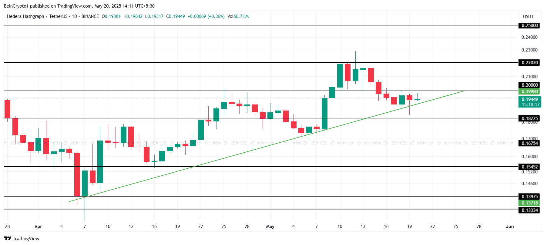 HBAR käy tällä hetkellä kauppaa hintaan 0,194 dollaria, juuri merkittävän vastustason 0,200 alapuolella. Altcoin on osoittanut tasaista kasvua viimeisen kuukauden aikana, ja nykyisen positiivisen markkinatunnelman myötä sen odotetaan jatkavan nousuaan. Onnistunut nousu yli 0,200 voisi vahvistaa nousujohteisen suuntauksen ja avata tien lisänousuille.