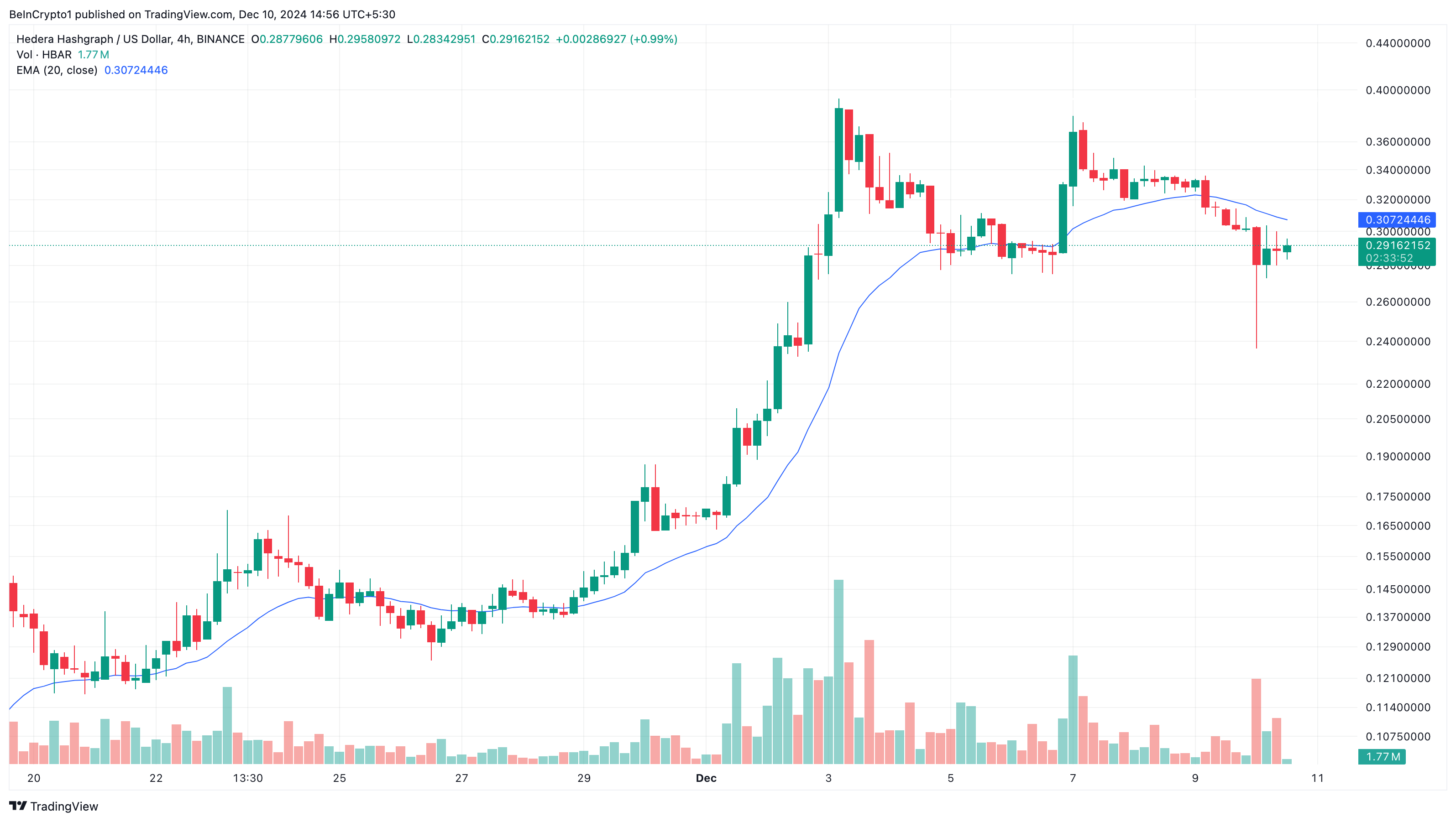 HBAR/USD 4-tunnin kaavion mukaan altcoin on pudonnut alle 20 jakson EMA:n, mikä viittaa laskutrendiin. Historiallisesti, kun näin tapahtuu, omaisuusvaran arvo laskee paljon alemmas kuin se on ollut. Siksi on suuri mahdollisuus, että HBAR:n arvo voisi laskea alle 0,29 dollarin lyhyellä aikavälillä.