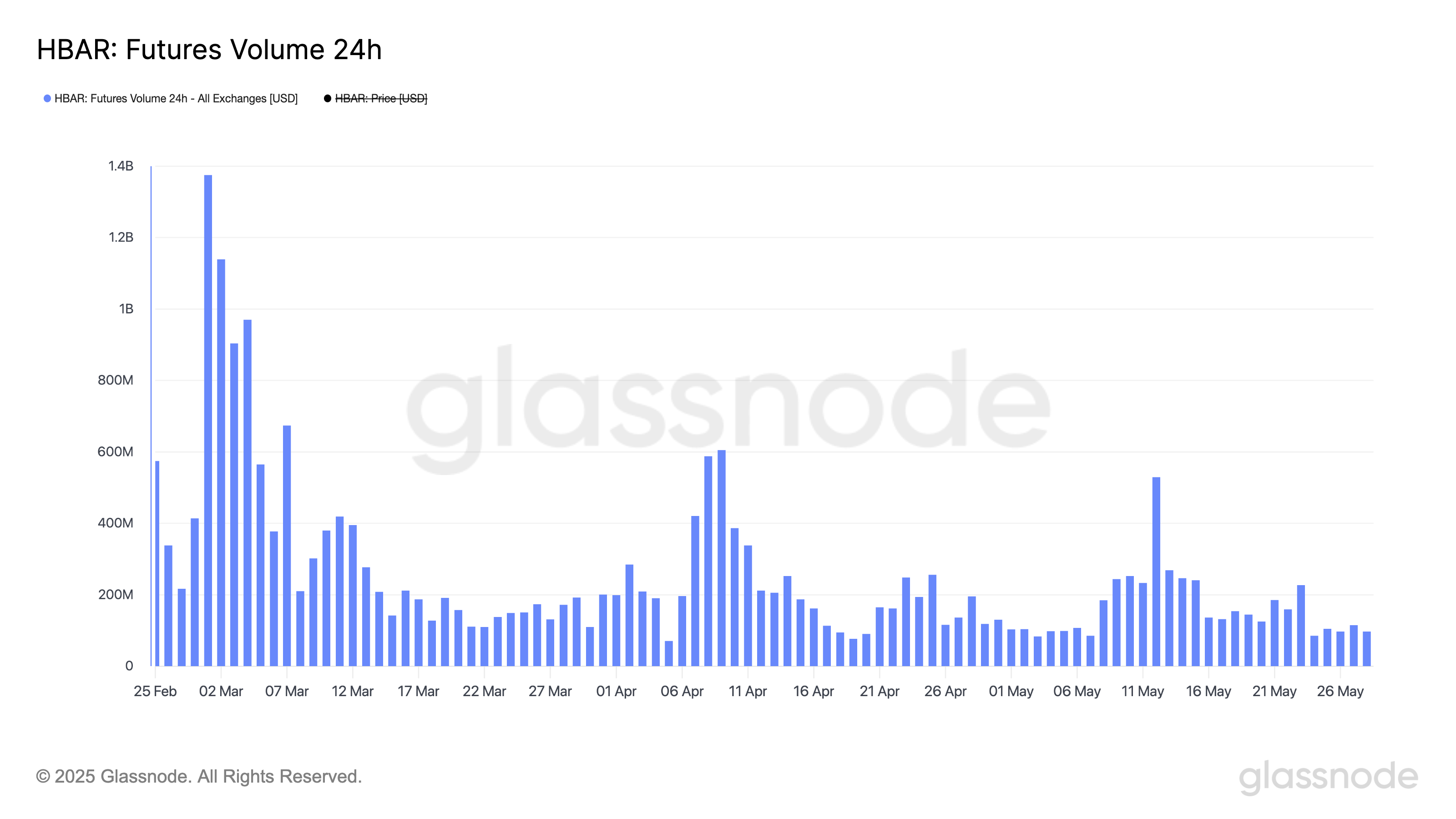 HBAR-futuurien volyymi on pudonnut 96,5 miljoonaan dollariin ja pysynyt alle 100 miljoonan dollarin viiden peräkkäisen päivän ajan, mikä on jyrkkä kontrasti vuoden alun korkeisiin tasoihin verrattuna.