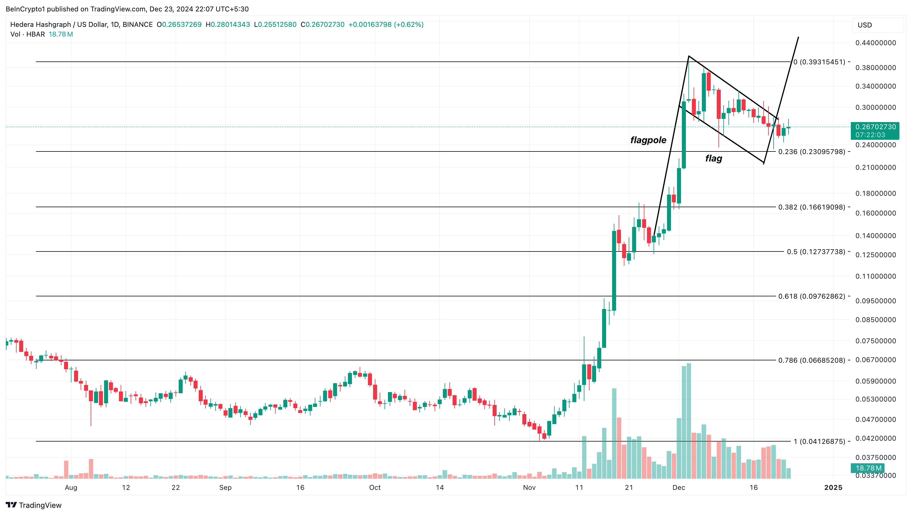 Teknisestä näkökulmasta BeInCrypto havaitsi bull flag -kuvion muodostumisen HBAR/USD-kaaviossa. Bull flag on kuvio, joka muistuttaa lippua tangossa. Se muodostuu voimakkaan nousutrendin aikana, jossa jyrkkä alkuperäinen hintaralli (“lipputanko”) seuraa konsolidaatiovaihetta (“lippu”).