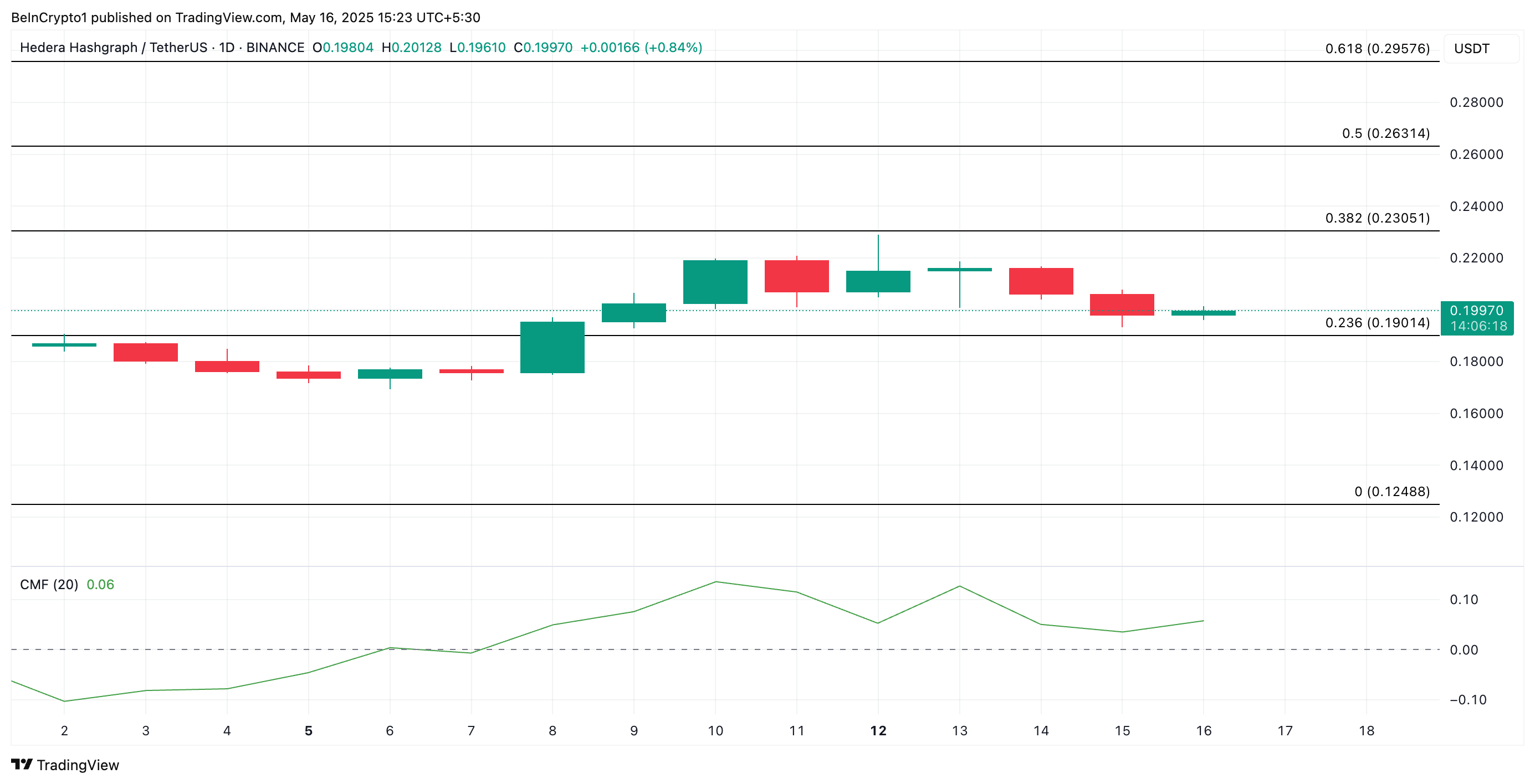 Päivittäisessä kaaviossa HBAR:n Chaikin Money Flow (CMF) -indikaattorin lievä nousu tänään vahvistaa ostopaineen elpymisen. Kirjoitushetkellä CMF on 0,06.