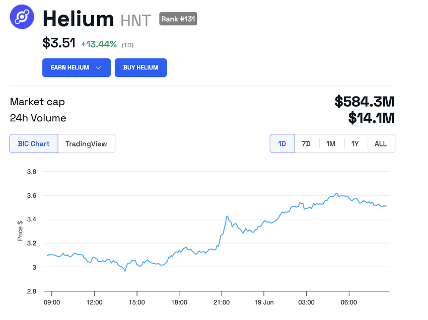 Tämän ohjelman lisenssimaksut saattavat vaikuttaa Heliumin tuloihin. Tämän kehityksen vuoksi Heliumin HNT-tokenin hinta on noussut 13,44 % viimeisen 24 tunnin aikana ja käy tällä hetkellä 3,51 dollarissa. HNT-token on kuitenkin edelleen laskenut yli 95 % tammikuun 2022 huipuistaan.
