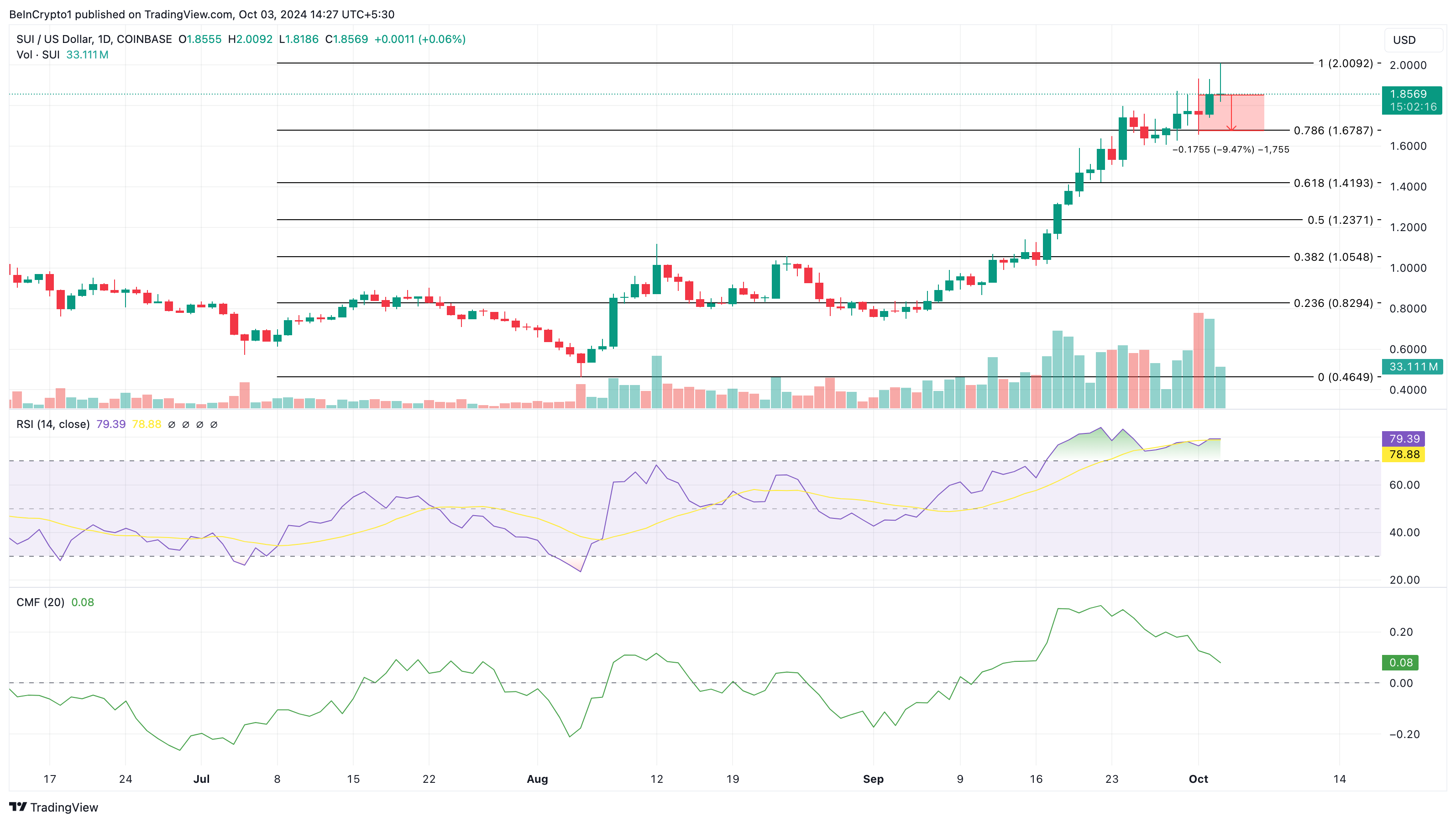 Viimeaikaisen nousun, joka johtui korkeasta kysynnästä ja spekulatiivisesta kaupankäynnistä, jälkeen SUI:n hinta saattaa laskea kaksinumeroisilla prosenteilla. Tämä seuraa 124 %:n 30 päivän hinnannousua, mikä teki altcoinista parhaiten suoriutuneen kryptovaluutan sadan kärjessä.