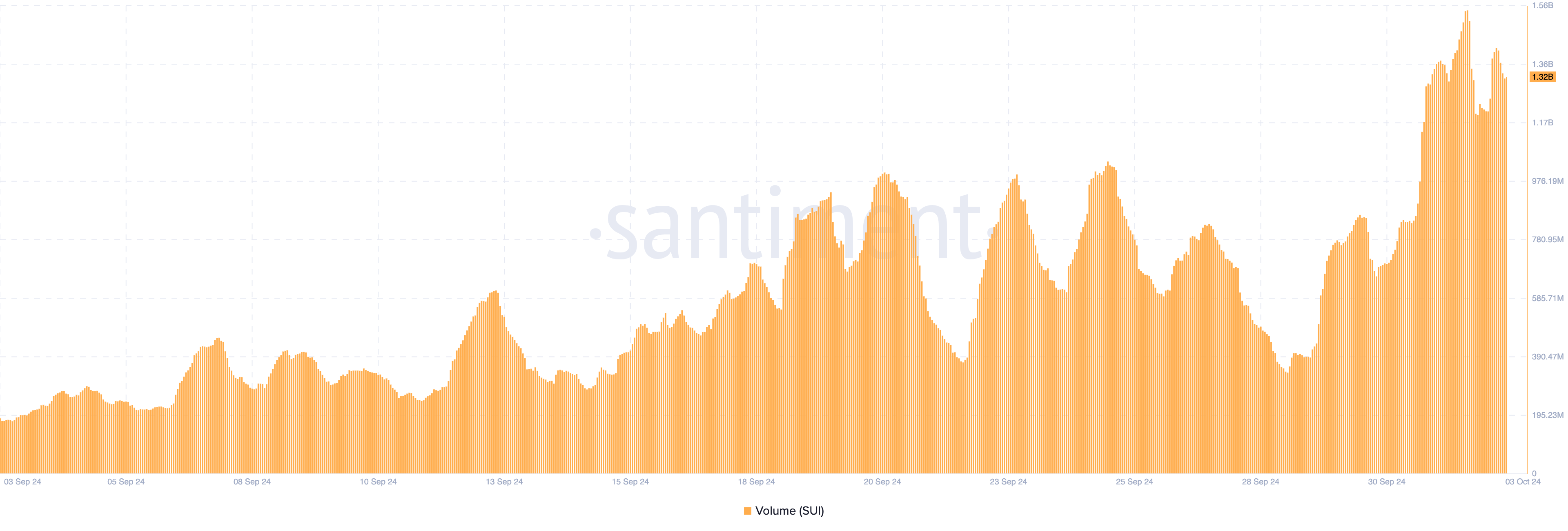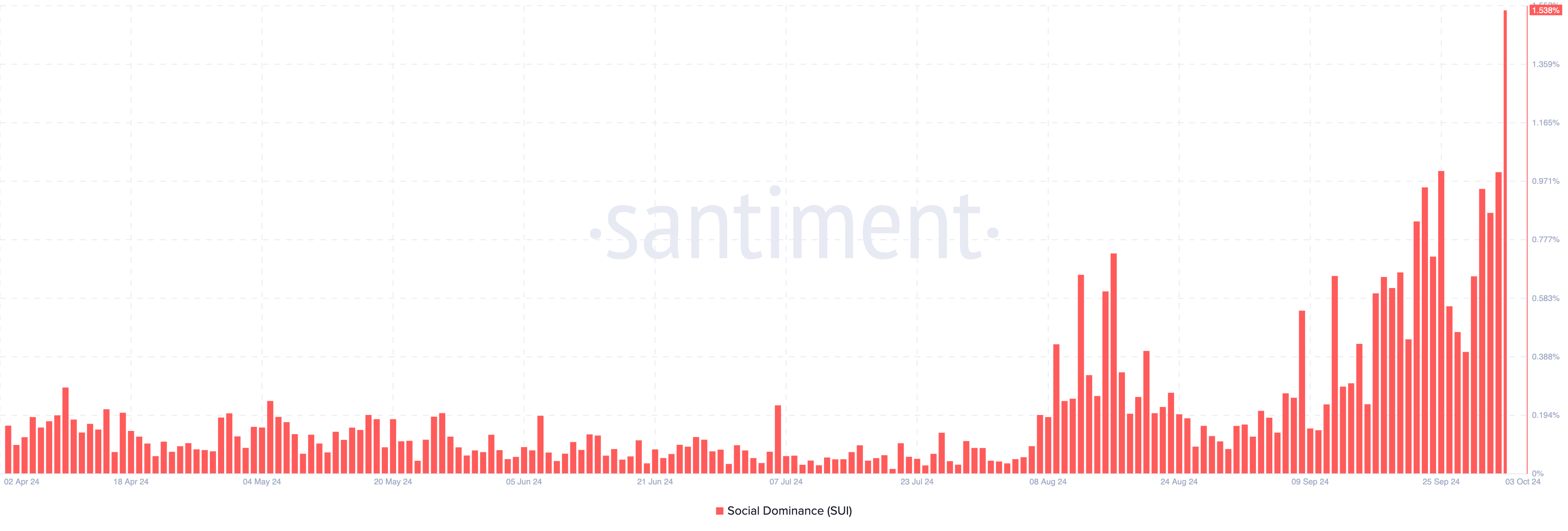 Vaikka Suin hinnan lasku on ollut vähäistä, sen sosiaalinen dominanssi on räjähtänyt. Santimentin mukaan projektin sosiaalinen dominanssi oli eilen, lokakuun 2. päivänä 0,99. Mutta lehdistöhetkellä tuo suhde on noussut 1,53 %:iin.