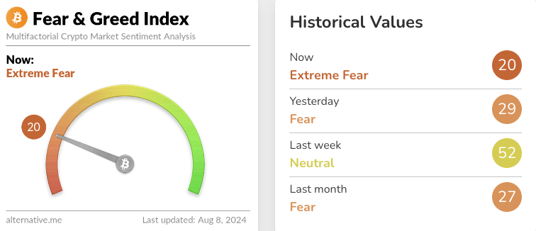 Samaan aikaan laajempi markkinatunnelma on edelleen pelokas. Kryptovaluuttojen pelko ja ahneus -indeksi on 20, mikä viittaa äärimmäiseen pelkoon.