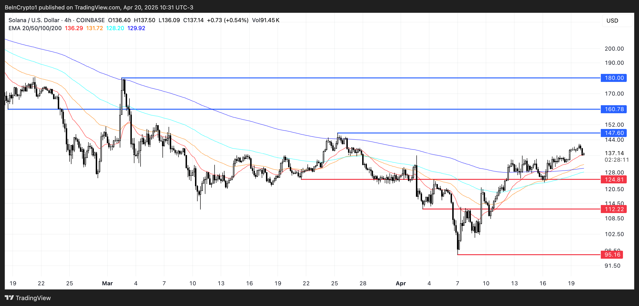 Jos tämä positiivinen suuntaus jatkuu, SOL voisi haastaa vastuksen 147 dollarissa. Selkeä läpimurto tämän tason yläpuolella voi johtaa lisänousuihin kohti 160 dollaria ja mahdollisesti 180 dollaria.