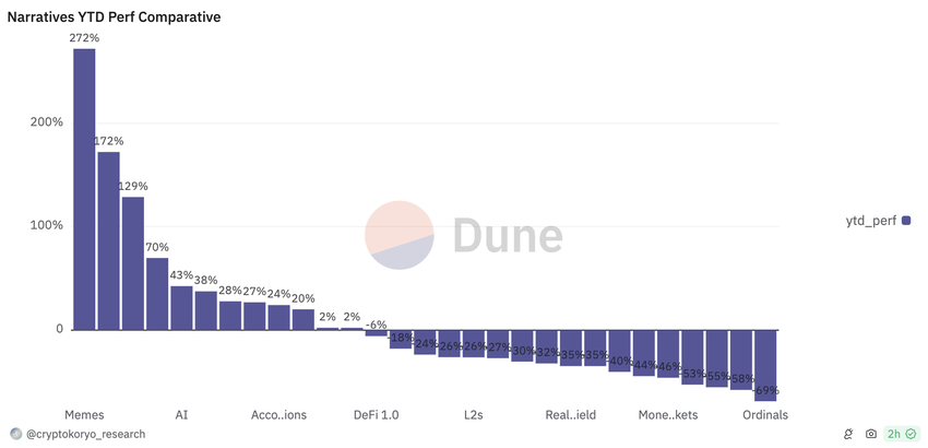 “Tämä on ollut Bitcoin-narratiivin johtama sykli… Tietyt narratiivit ovat menestyneet huomattavasti paremmin (ja suuret markkinat ovat jääneet jälkeen). Meemit, tekoäly ja RWA ovat olleet selkeitä johtajia tähän mennessä tällä syklillä “, hän lisäsi.