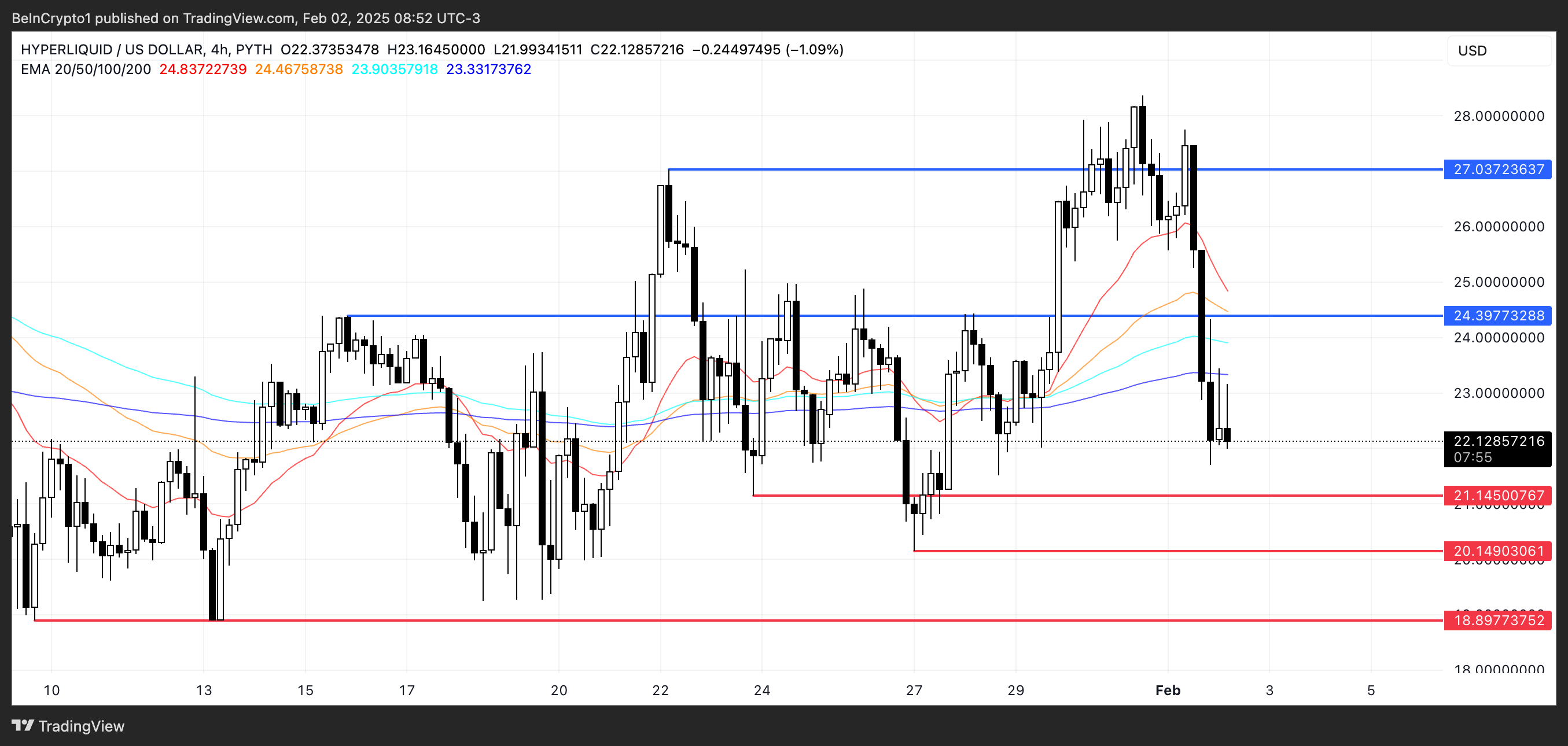 Jos ne risteävät alapuolelle—death cross—se viittaisi vahvempaan laskutrendiin. Siinä tapauksessa HYPE voisi testata keskeistä tukea 21,1 dollarissa. Jos tämä taso murtuu, lisälasku voisi painaa hinnat 20,1 dollariin tai jopa 18,89 dollariin, mikä olisi alin taso sitten tammikuun 13. päivän. Tämä skenaario vahvistaisi myyntipaineen kasvun ja pitkittyneen laskutrendin.