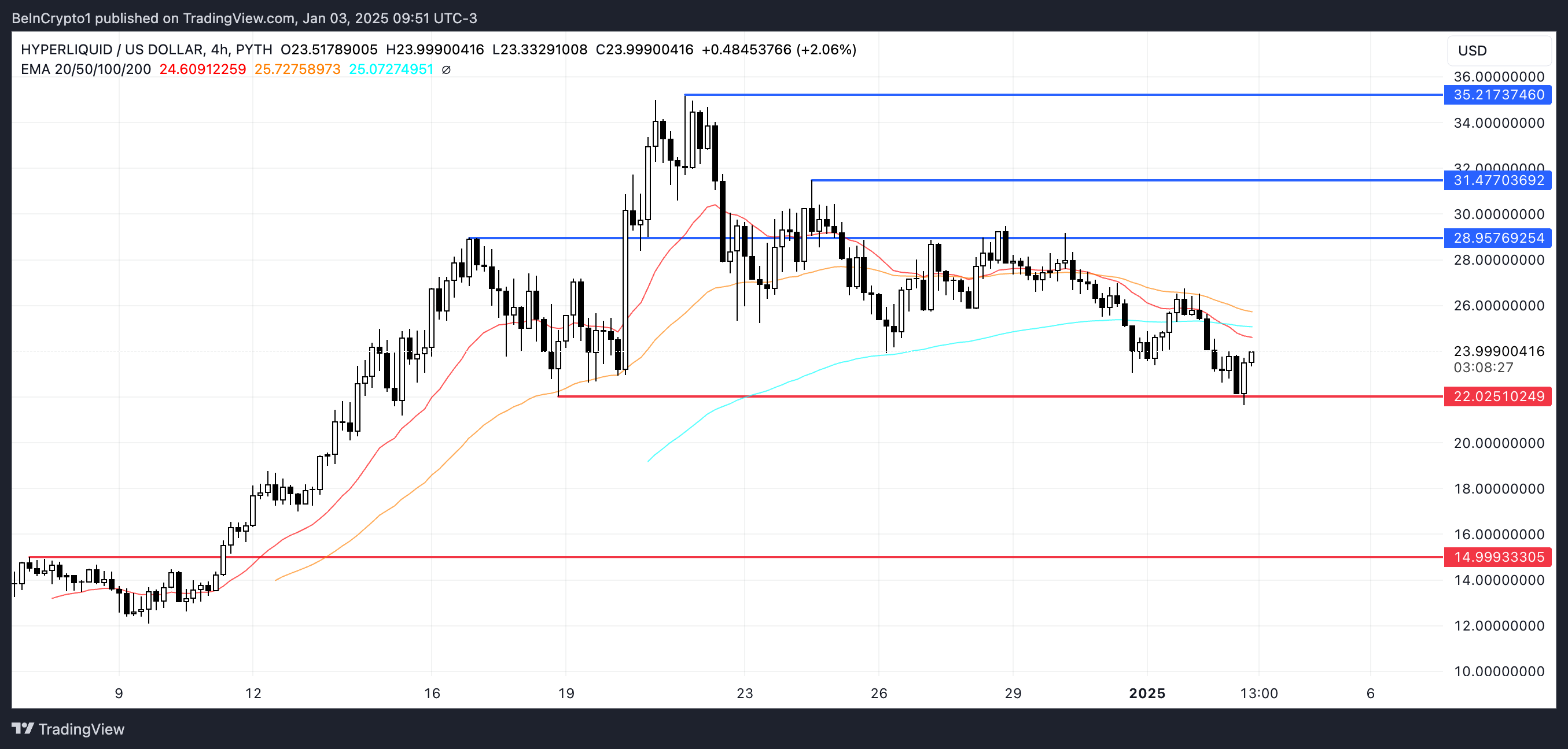 Toisaalta, jos laskutrendi jatkuu ja myyntipaine voimistuu, HYPE saattaa testata välitöntä tukeaan 22,00 dollarissa. Jos tämä tuki ei pidä, hinta voi laskea edelleen 14,99 dollariin, mikä merkitsisi merkittävää 37 % korjausta.