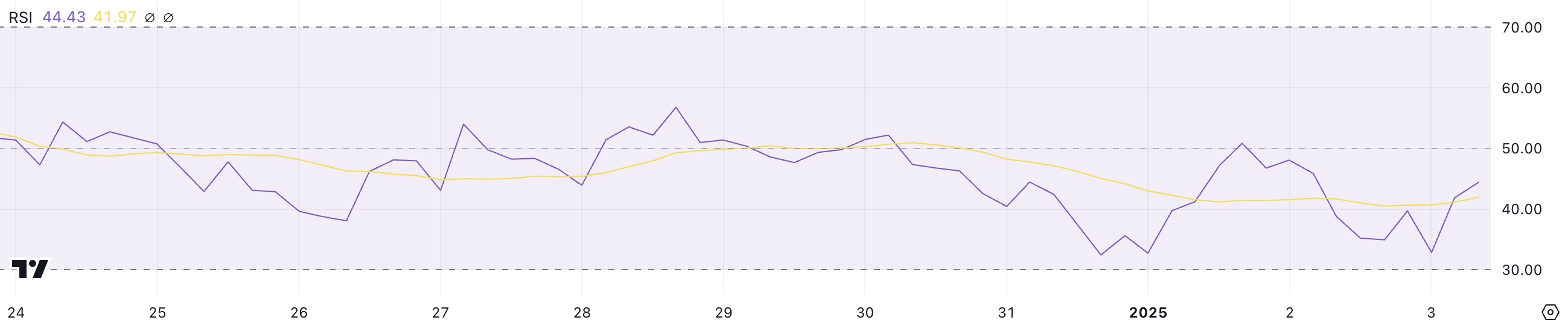 HYPE, yksi vuoden 2024 suurimmista airdropeista, näyttää tällä hetkellä suhteellisen voimaindeksinsä (RSI) olevan 44,4, mikä on huomattava nousu viime päivien 32,8:sta. RSI, laajalti käytetty momentum-indikaattori, mittaa hintaliikkeiden nopeutta ja suuruutta asteikolla 0:sta 100:aan.