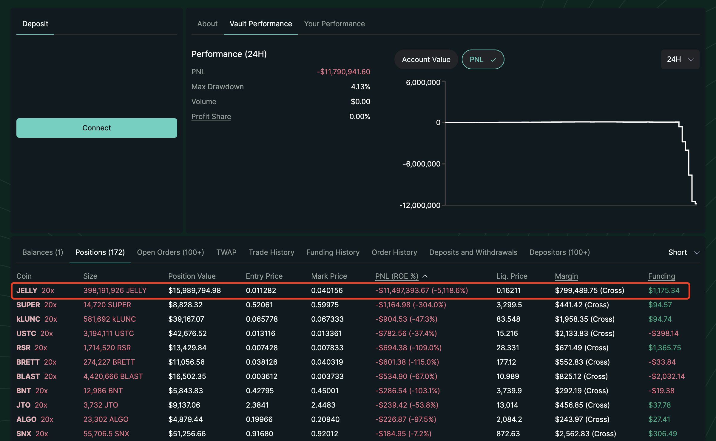 Valas ensin myi tokenit, mikä romahdutti hinnan ja pakotti HLP:n massiiviseen passiiviseen shorttiin. Sitten, ostamalla takaisin ja nostamalla hintaa, valas aiheutti lähes 12 miljoonan dollarin tappion HLP:lle.