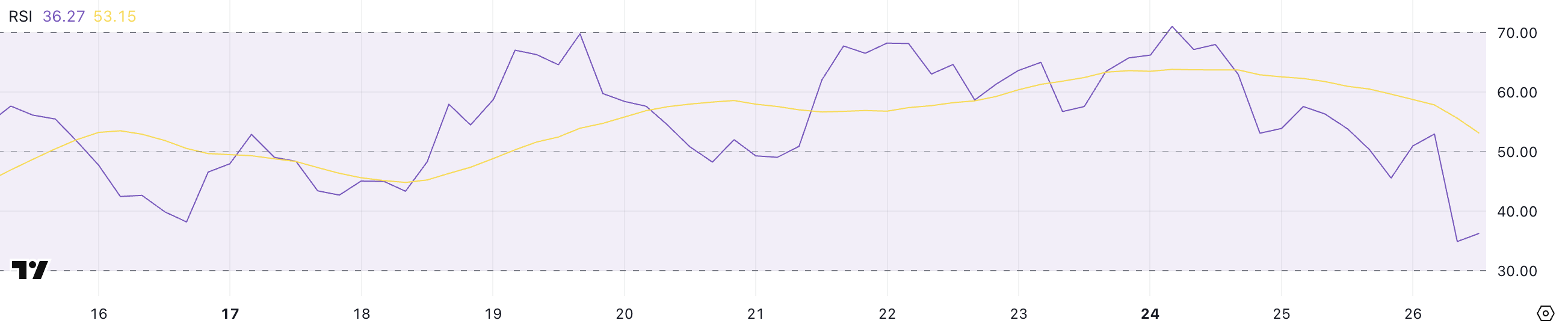HYPEn RSI on pudonnut 36,27:ään, mikä on jyrkkä lasku 71:stä vain kaksi päivää sitten. Tämä lasku heijastaa nopeaa tunnelman muutosta hyväksikäyttöuutisten jälkeen, jotka laskivat hintaa lyhyen palautusyrityksen jälkeen.