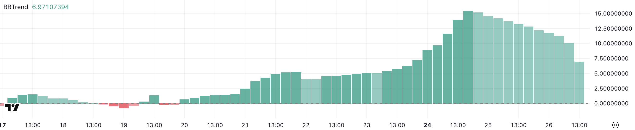 Samaan aikaan HYPEn BBTrend laski 10:stä 6,97:ään hyväksikäytön jälkeen, mutta on pysynyt positiivisella alueella kuusi päivää peräkkäin. BBTrend, eli Bollinger Band Trend, mittaa hintatrendien vahvuutta Bollinger Bandsin laajenemisen perusteella.