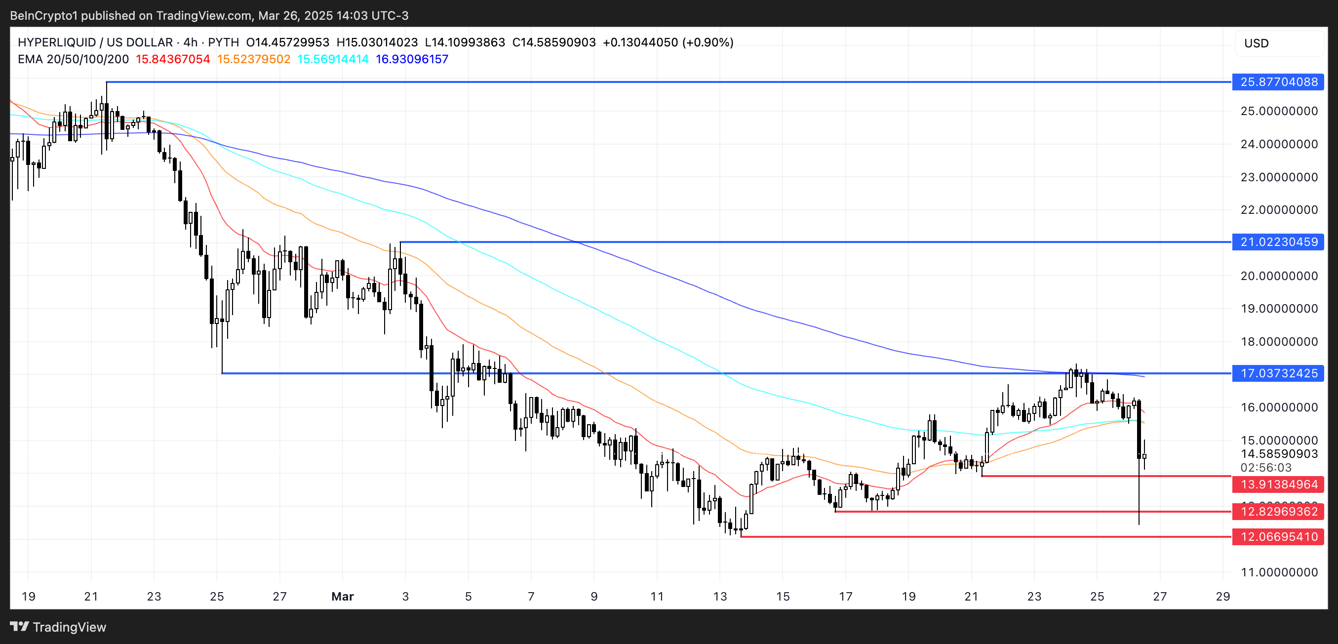 Jos nykyinen korjaus jatkuu, HYPE voi pian testata tärkeää tukea 13,91 dollarissa. Tämä liike voi kiihtyä death crossin muodostumisen myötä, jonka EMA-linjat viittaavat tapahtuvan pian.