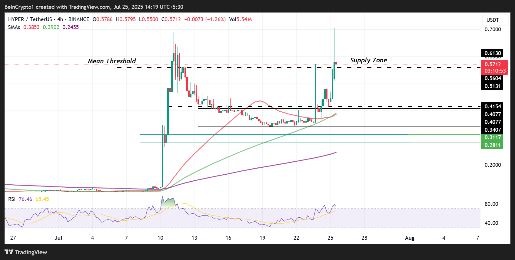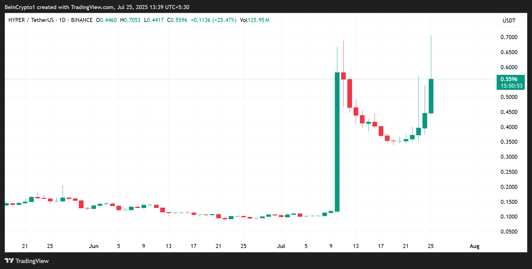 HYPER on noussut 25 % viimeisen 24 tunnin aikana, ja sen hinta on 0,5596 dollaria tätä kirjoitettaessa. Tämä merkitsee maltillista vetäytymistä sen jälkeen, kun Hyperlanen natiivi token nousi uuteen kaikkien aikojen korkeimpaan (ATH) hintaan 0,7053 dollaria.