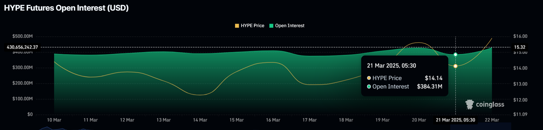 Viimeisen 24 tunnin aikana Hyperliquidin Open Interest on noussut 44 miljoonalla dollarilla, mikä nostaa kokonaismäärän 428 miljoonaan dollariin. Tämä kasvu seuraa viimeaikaista hinnannousua, joka on lisännyt suuntausta jatkuvaan elpymiseen.