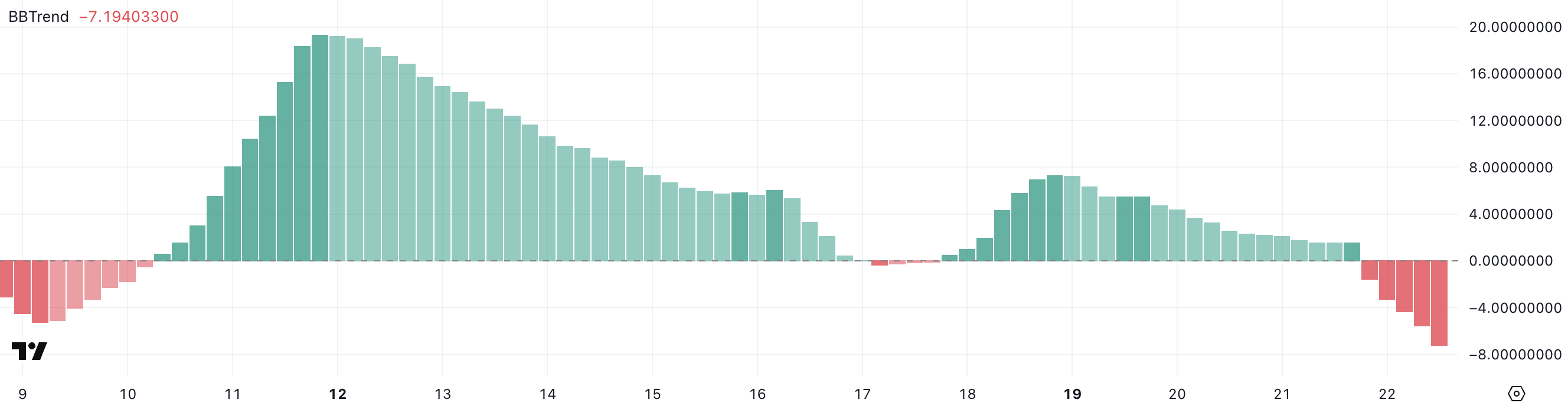 BBTrend-lukema -7,19 osoittaa äkillistä siirtymistä kohti karhumaista tunnelmaa. Tämä jyrkkä pudotus voi heijastaa kasvavaa volatiliteettia alaspäin ja voi johtaa lisämyynteihin, jos suuntaus jatkuu.