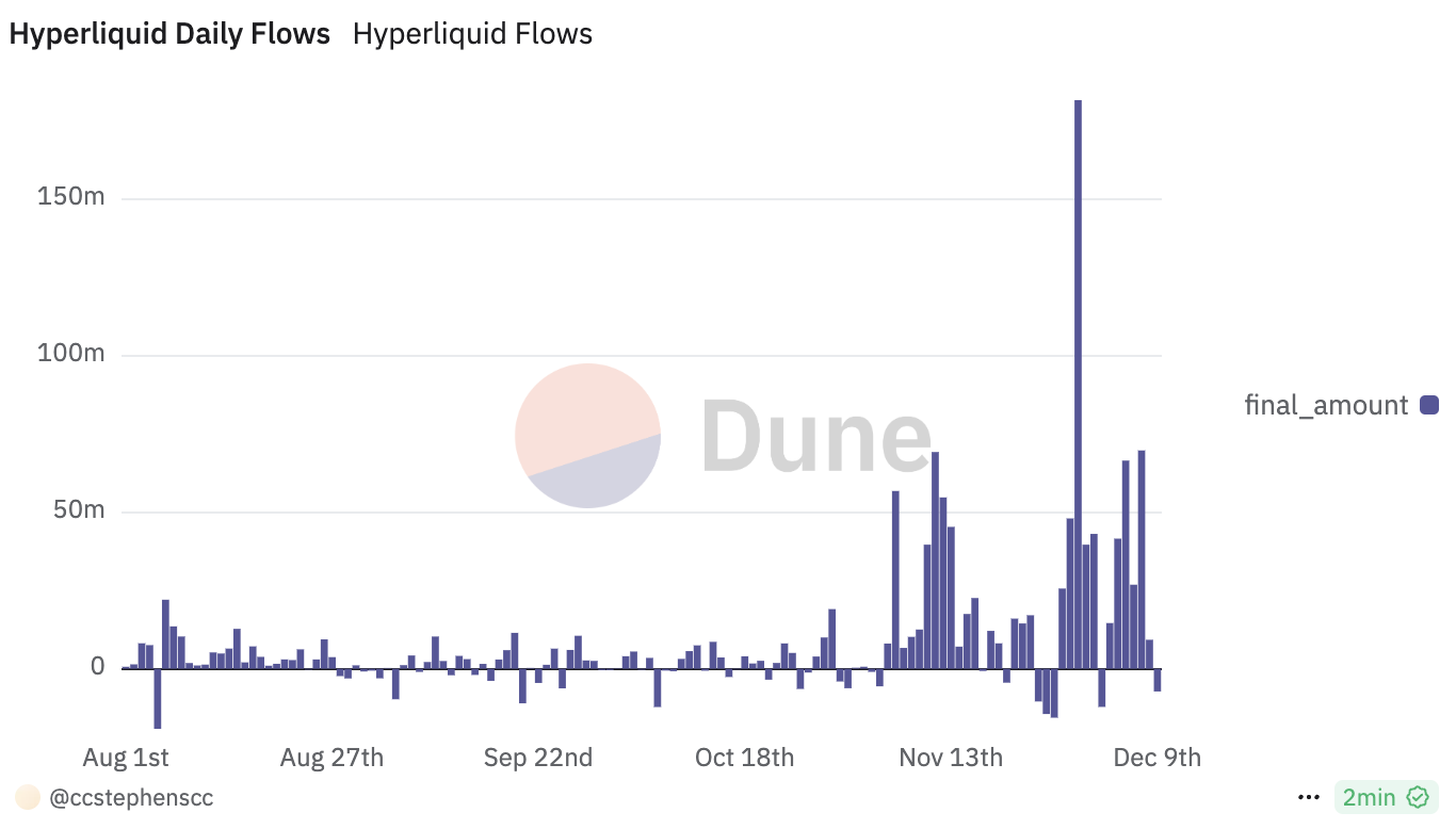 Hyperliquid nettovirtojen kaavio osoittaa merkittävää kasvua, saavuttaen kaikkien aikojen ennätyksen yli 181 miljoonaa dollaria 29. marraskuuta. Tämän jälkeen se laski 66 miljoonaan dollariin 5. joulukuuta ja nousi hieman 69 miljoonaan dollariin 7. joulukuuta.