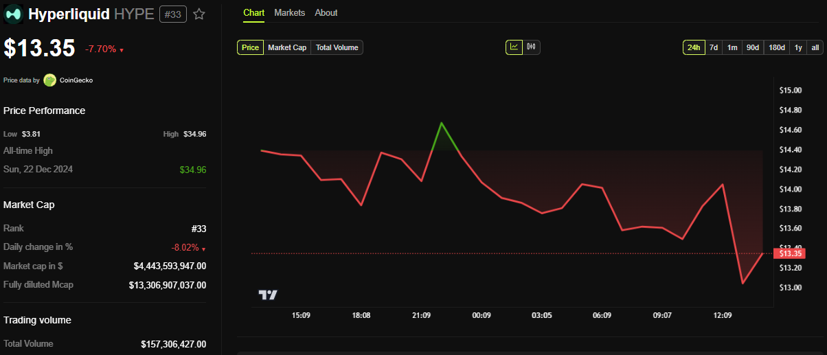 BeInCrypto tiedot osoittavat, että Hyperliquidin tokenin hinta on laskenut lähes 8 % keskiviikon istunnon avautumisesta. Tätä kirjoitettaessa HYPE:n hinta oli 13,35 dollaria.