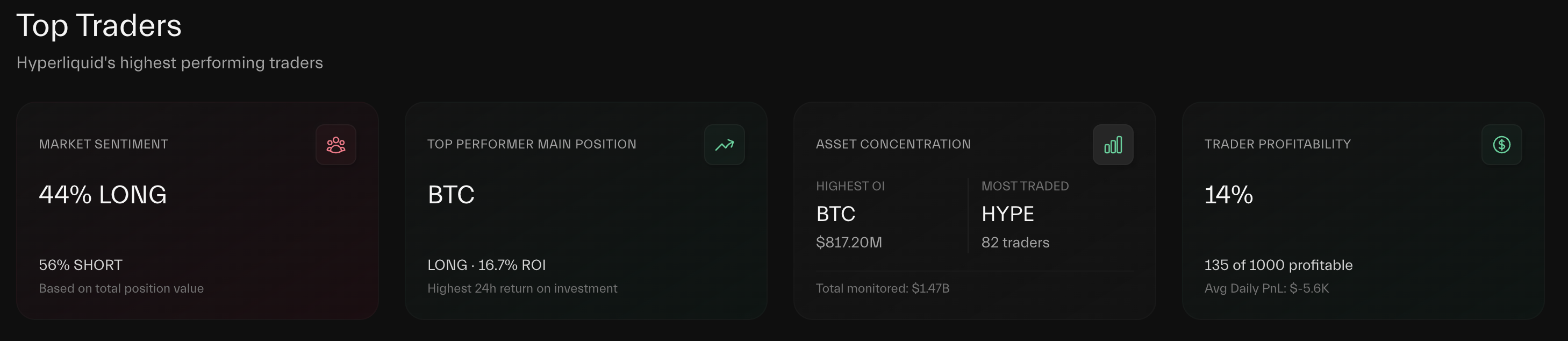 Hyperdashin tietojen mukaan vain 135 1 000 kauppiaan otoksesta on kirjannut voitollisia tuloksia. Kaikkien kauppiaiden keskimääräinen päivittäinen voitto tai tappio (PnL) on 5 600 dollaria tappiota.