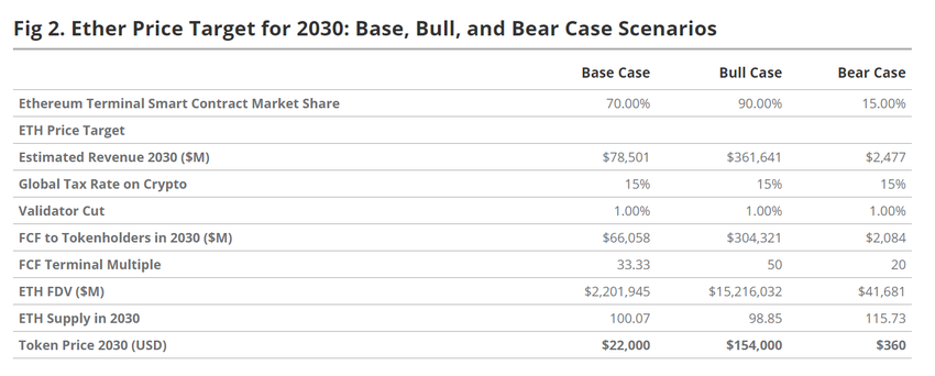 Tämän analyysimallin perusteella VanEckin analyytikot suhtautuvat myönteisesti Ethereumin tulevaisuuteen ja ennustavat, että sen hinta voi nousta 22 000 dollariin tokenia kohden vuoteen 2030 mennessä.