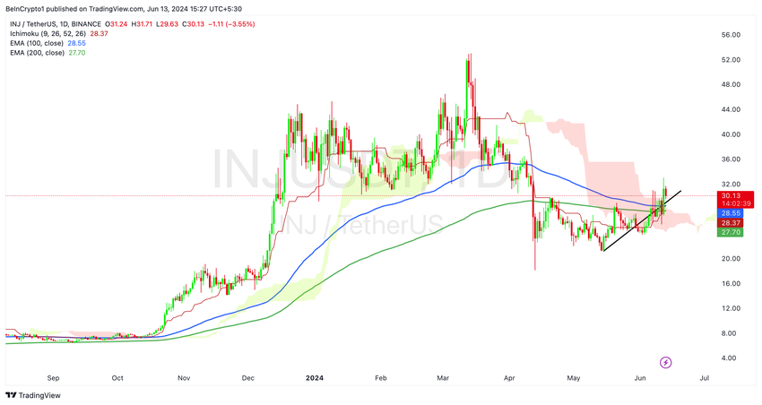 Äskettäisessä analyysissä BeInCrypto ennusti, että Injective (INJ) voi tunkeutua päivittäiseen Ichimoku-pilveen, mikä merkitsee vahvoja ostosignaaleja. Tämä ennuste on osoittautunut oikeaksi, koska INJ on onnistuneesti murtautunut pilven läpi ja käy nyt kauppaa 30 dollarissa, ja huippu on 33 dollaria.