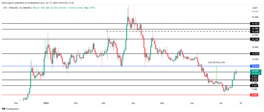 ICP:n hinta on noussut yli 37 % viimeisen viikon aikana, mikä on tuonut altcoinin kaupankäynnin 10,04 dollariin kirjoitushetkellä. Altcoinin vastus on kuitenkin 10,83 dollaria, taso, joka on testattu tiukasti tukilattiana.