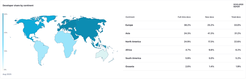 Vuoden 2024 lopusta elokuuhun 2025 Aasian maat vakiinnuttivat asemansa maailman nopeimmin kasvavana Web3-, lohkoketju- ja kryptovaluutan käyttöönoton keskuksena. Alueen nousu perustuu syvään vähittäiskaupan penetraatioon, suureen kaupankäynnin likviditeettiin ja nopeaan stablecoinin omaksumiseen. Samaan aikaan Pohjois-Amerikka ja Eurooppa ovat edenneet rinnakkaisilla raiteilla keskittyen institutionaaliseen integraatioon, ydinprotokollakehitykseen ja infrastruktuurin laajentamiseen.