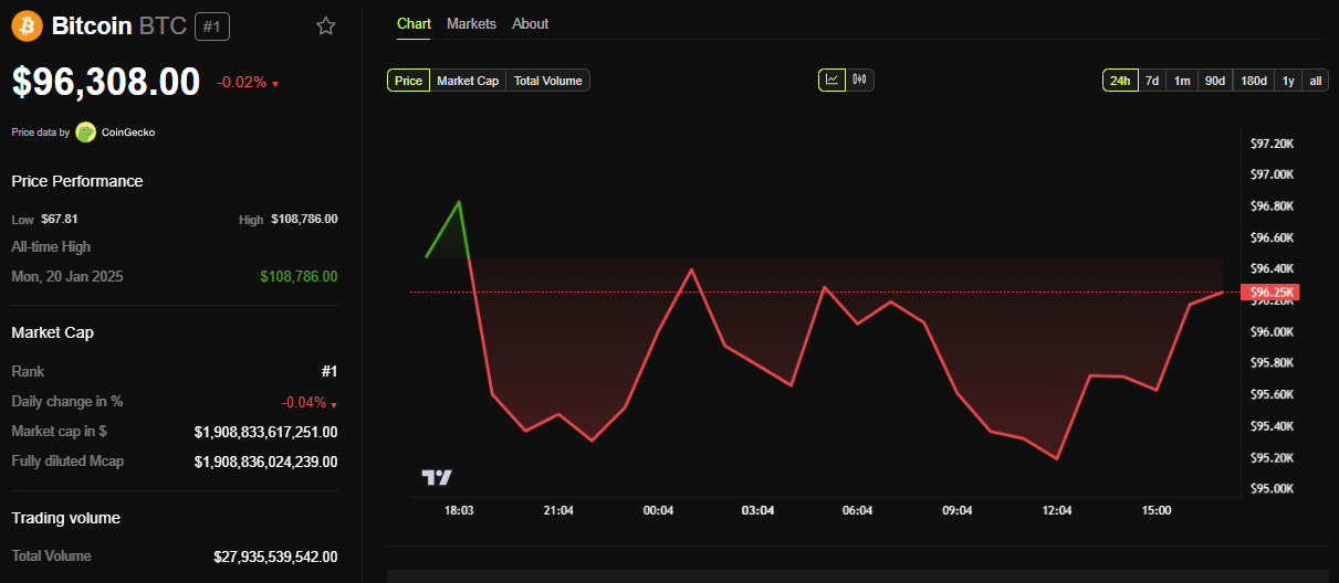 Bitcoinin hinta pysyy muuttumattomana tämän spekulaation myötä. Tätä kirjoitettaessa BTC:n hinta oli 96 308 dollaria, laskien 0,02 % tiistain session avauduttua.