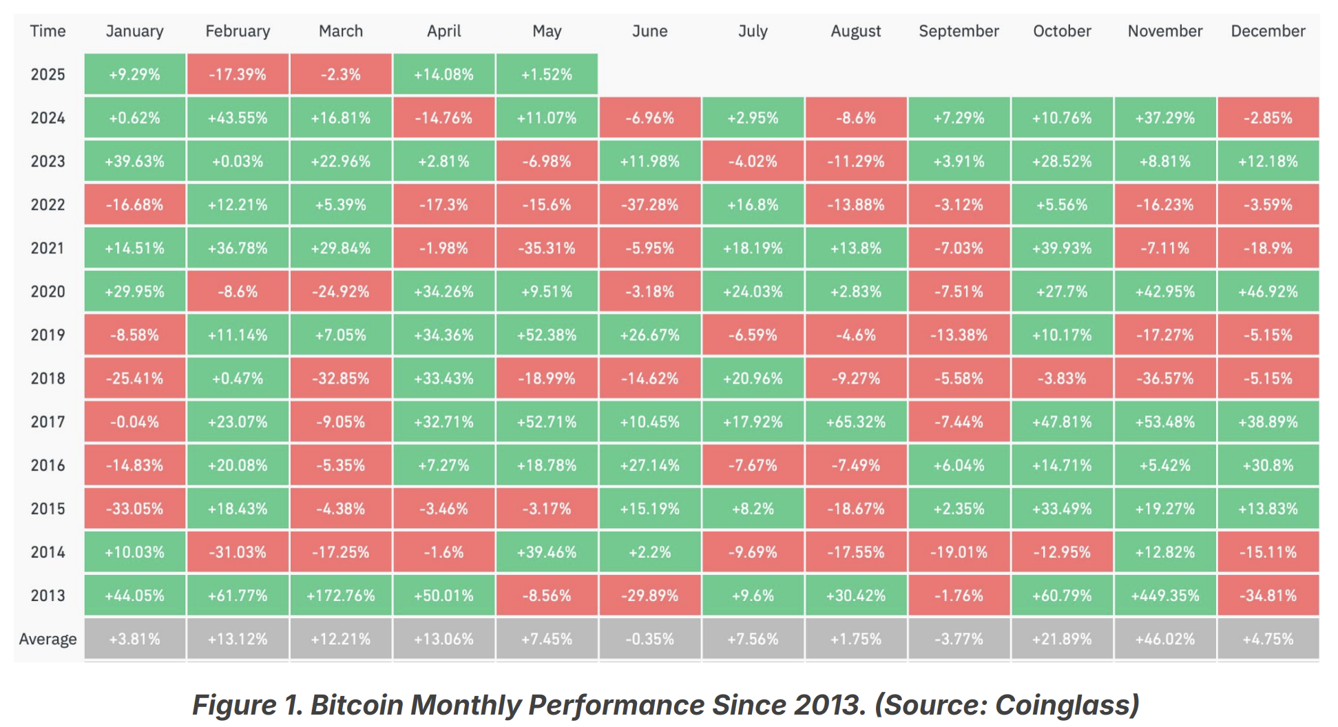 Viimeisimmässä raportissaan Bitfinex huomautti, että Bitcoinin suorituskyky huhtikuussa ylitti keskimääräisen tuoton. Huhtikuussa 2025 BTC kirjasi kuukausittaisen nousun 14,08 %. Tämä oli korkeampi kuin sen historiallinen keskiarvo 13 % ja mediaanituotto 7,3 %.