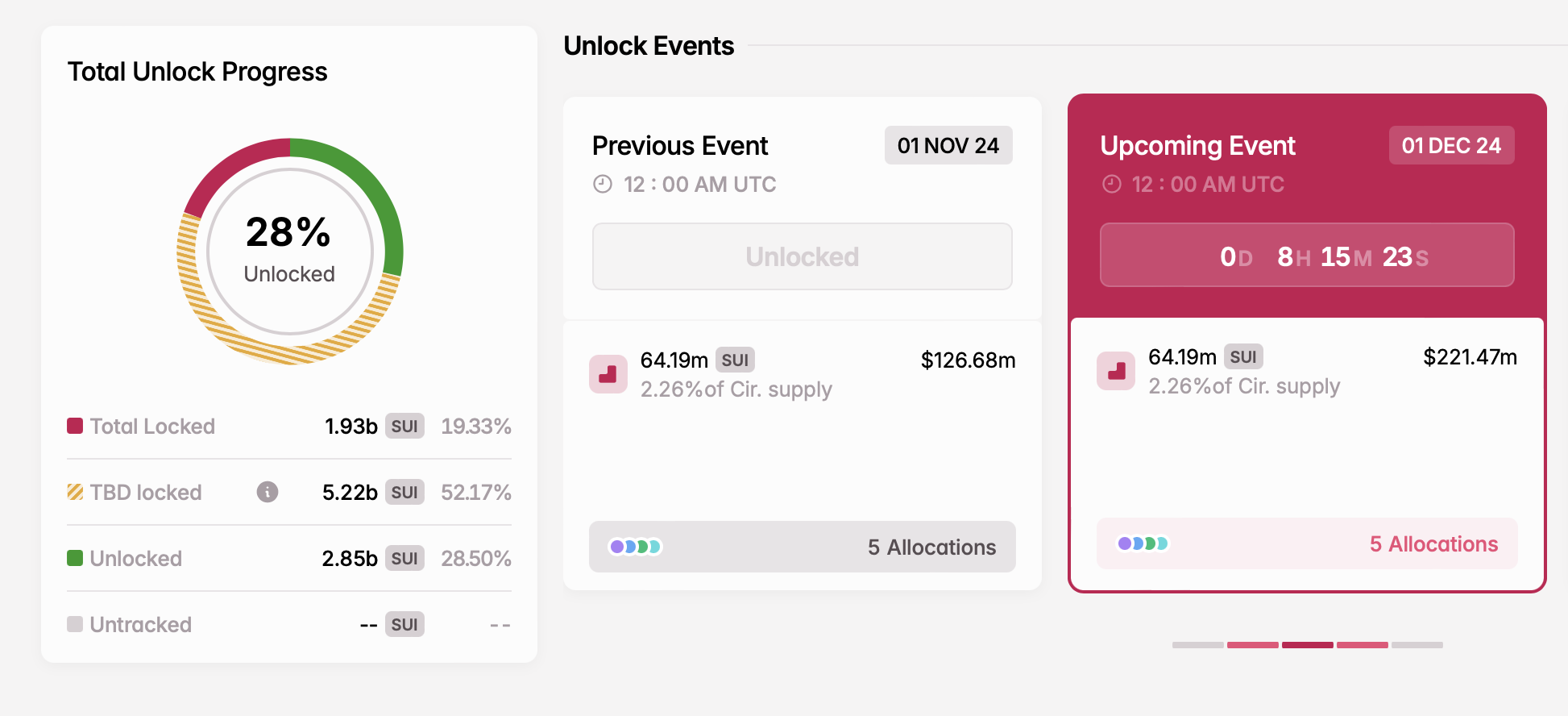 Joulukuun 1. päivänä Sui vapauttaa 64,19 miljoonaa tokenia, joiden arvo on nykyisillä hinnoilla 221,47 miljoonaa dollaria. Näiden tokenien jakautuminen on seuraava:
