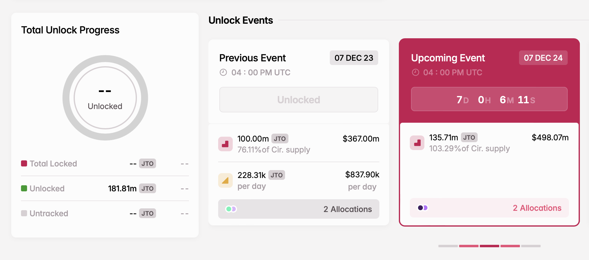 Joulukuun 7. päivänä Jito aikoo vapauttaa 135,71 miljoonaa tokenia, joiden arvo on noin 498 miljoonaa dollaria. Tämä vapautus ylittää JTO:n nykyisen kiertävän tarjonnan. Tokenien jakautuminen on seuraava: