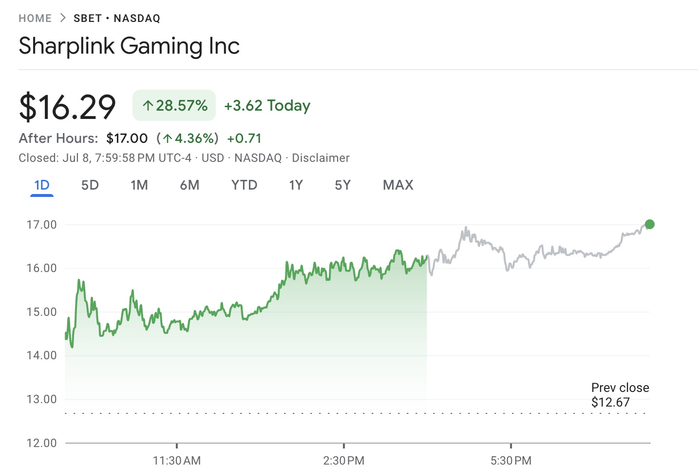 Paljastuksen jälkeen SharpLink Gamingin osake, SBET, nousi kaksinumeroisesti. Google Financen tiedot osoittivat, että osakehinnat nousivat 28,57 % markkinoiden sulkeutuessa. Lisäksi SBET koki vielä 4,36 % nousun jälkimarkkinakaupassa.