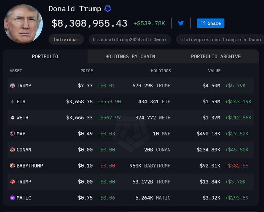 Kojelauta paljastaa lisäksi, että Donald Trumpin, yrittäjän ja entisen Yhdysvaltain presidentin, kryptonettovarallisuus on 8.3 miljoonaa dollaria. Hänen suurin omistuksensa on MAGA-meemikolikko (TRUMP), jonka arvo on noin 4.5 miljoonaa dollaria.