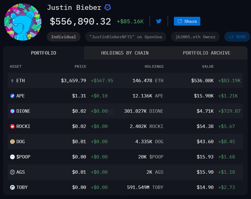 Muita merkittäviä Bieber-omistuksia ovat ApeCoin (APE) ja Dione (DIONE). Hän omistaa 12 136 APE ja 301 027 DIONE, joiden arvo on 15 900 dollaria ja 4 710 dollaria.