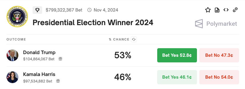 Lisäksi kiinnostusta herättävät nykyiset vedonlyöntikertoimet Polymarketissa, jossa spekuloidaan ehdokkaiden poliittisilla tulevaisuuksilla. Tällä hetkellä Donald Trump johtaa 53 %:n todennäköisyydellä voittaa, kun taas Kamala Harris on jäljessä 46 %:n mahdollisuudella.