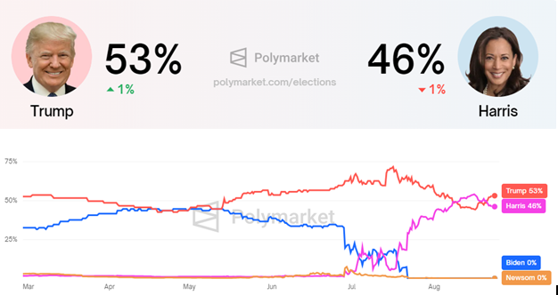 Yhdysvaltain vaalien odotuksen keskellä Trump on jälleen johdossa Polymarketin ennustetaulukossa. Hänellä on 53 % Harrisin 46 % vastaan.