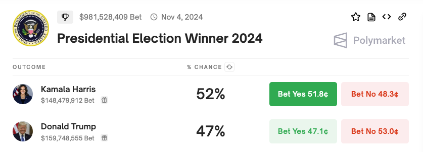 Siitä huolimatta, että Trump on tehnyt näitä eleitä, hän on jäänyt Harrisin taakse ennustemarkkinoilla. Polymarketin mukaan Harrisilla on 52 % mahdollisuus voittaa, verrattuna Trumpin 47 %:iin. Tämä ero laajeni heidän väittelynsä jälkeen 10. syyskuuta, kun Trump ei maininnut kryptovaluuttoja, mikä petti joitakin alan seuraajia.