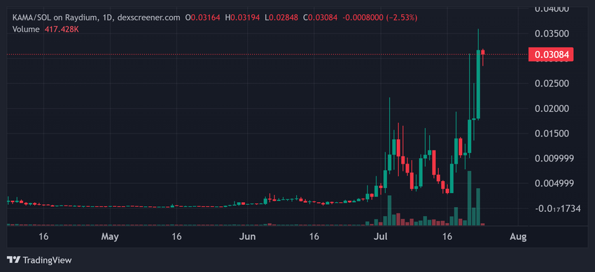 Tähän liittyvässä kehityksessä Harrisia ympäröivät uutiset ovat johtaneet häneen liittyvien meemikolikoiden nousuun. Kamala Horris (KAMA) -meemikolikon hinta nousi dramaattisesti yli 1 088 % viime viikolla. Kirjoitushetkellä kolikon arvo on 0,03084 dollaria, mikä merkitsee 69,05 prosentin kasvua viimeisen 24 tunnin aikana ja markkina-arvo 31,1 miljoonaa dollaria.