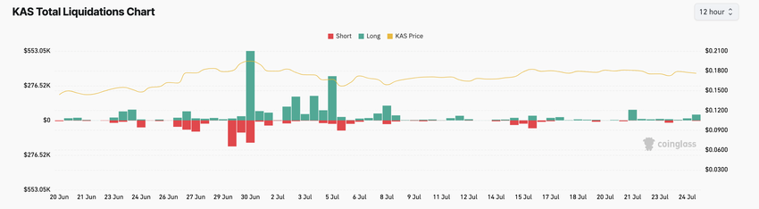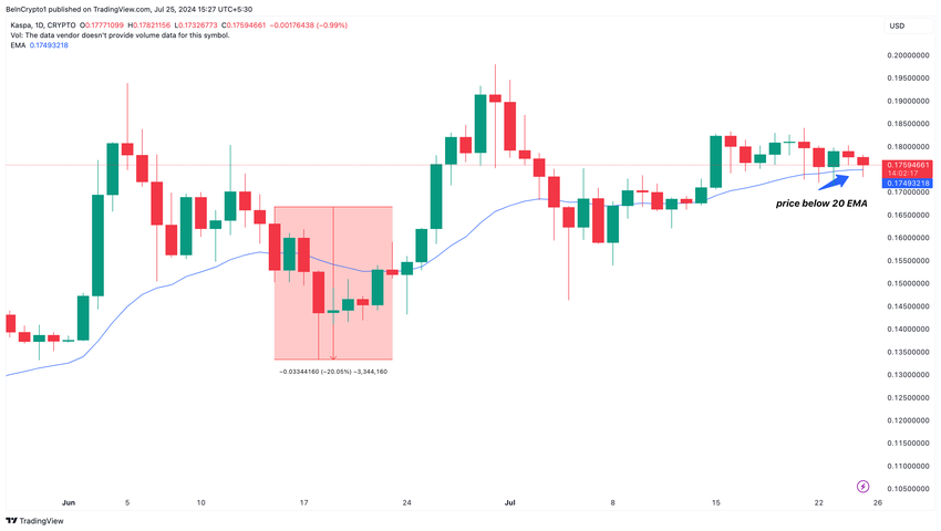 Suurimman osan heinäkuusta KAS kävi kauppaa EMA:n yläpuolella, mikä viittasi härkäsuuntaukseen. Tämä oli yksi syy, miksi arvo saavutti aiemmin 0,18 dollaria. Kirjoitushetkellä kryptovaluutta käy kauppaa 20 EMA:n alapuolella, mikä viittaa karhumarkkinaan. Viimeksi kun KAS:n hinta laski 20%, se saavutti 0,13 dollaria.
