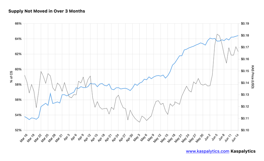 Toukokuusta tähän päivään KAS Supply, joka on ollut passiivinen yli kolme kuukautta, on kasvanut 57,18 prosentista 64,43 prosenttiin kiertävästä kokonaistarjonnasta, mikä merkitsee lyhytaikaisten haltijoiden vahvaa pitokäyttäytymistä.