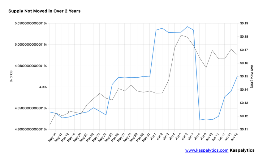 Tämän lisäksi havaittiin samanlainen pieni lasku Kaspan määrässä, jota ei ollut siirretty yli kahteen vuoteen, mikä viittaa haltijoiden voitonotto- ja riskinvähentämisstrategioihin. Erityisesti yli kahden vuoden ajan hallussa pidetty tarjonta laski 5 prosentista 4,8 prosenttiin koko liikkeessä olevasta tarjonnasta, mikä heijastaa pitkäaikaisten haltijoiden jonkinasteista myyntitoimintaa.