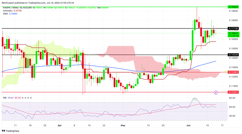 Aiemmassa analyysissä BeInCrypto julkaisi nousevan ennusteen Kaspalle (KAS), kun hinta kävi kauppaa 0,14 dollarissa.