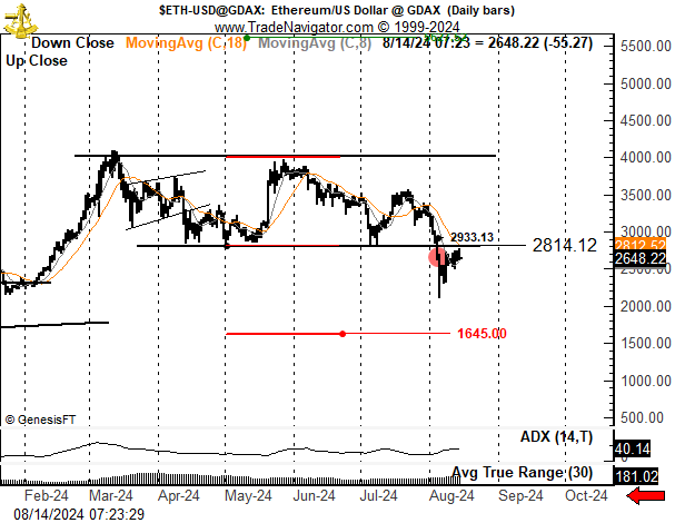 Kirjoitushetkellä ETH:n hinta on 2 627 dollaria. Lasku 1 651 dollariin tarkoittaisi 36 %:n pudotusta nykyisestä arvosta.