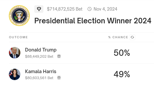 Huomattavasti Kennedyn tuki on vahvistanut Trumpin mahdollisuuksia, Polymarketin tiedot näyttävät hänet 50%:ssa, niukasti johtavan lähintä kilpailijaansa Harrisia, joka on 49%:ssa.