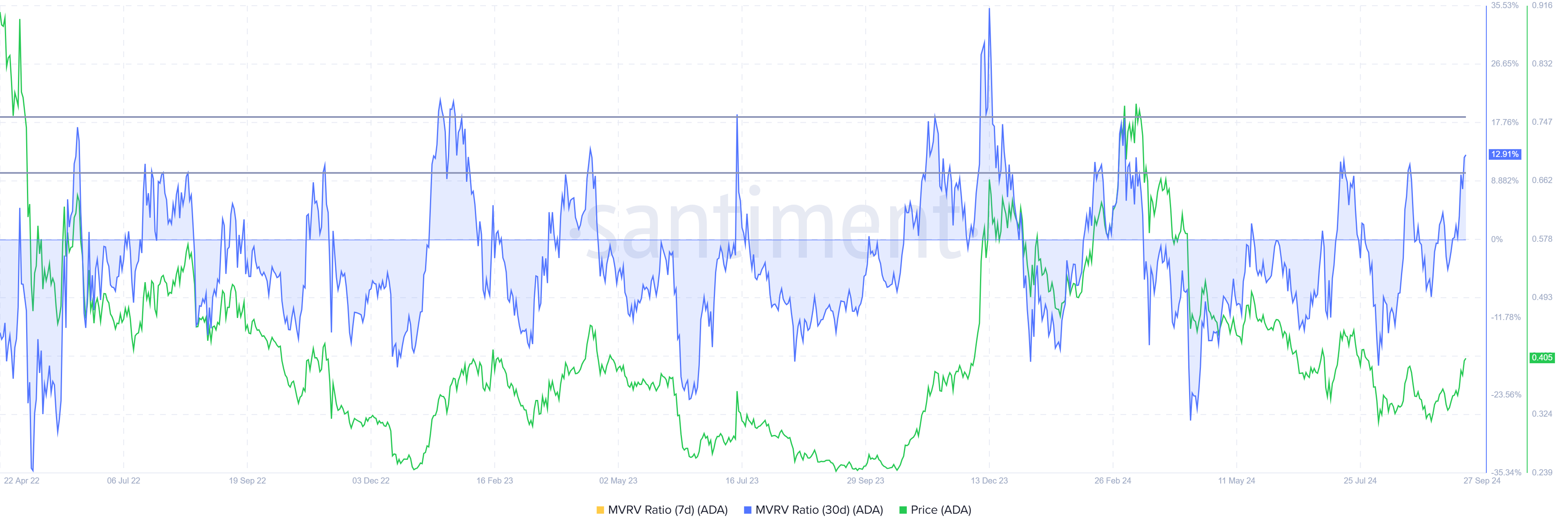 Cardanon MVRV-suhde väläyttää varoitusmerkkejä, sillä se sijaitsee tällä hetkellä vaara-alueella. 30 päivän MVRV-suhde, joka mittaa omistajien kannattavuutta, on saavuttanut 13 %, mikä osoittaa, että monet sijoittajat ovat voitolla.
